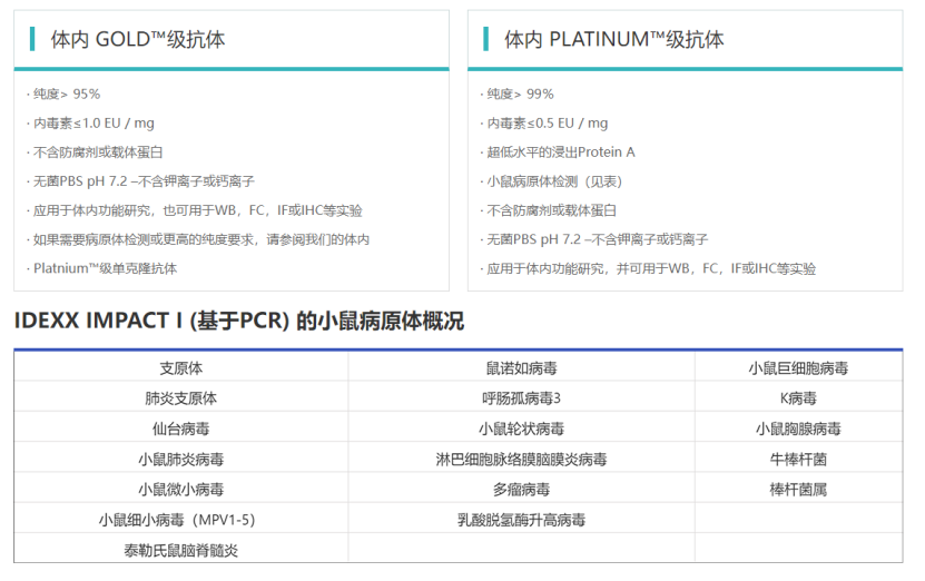 Leinco Technologies通過(guò)其特有的制備工藝,生產(chǎn)具有業(yè)內最高純度標準的體內功能級抗體。其In vivo PLATINUM™級功能抗體對于純度、內毒素、聚集體和浸出Protein A水平都有最為嚴格的質(zhì)控標準;此外,In vivo PLATINUM™級抗體均不含病原體,通過(guò)了IDEXX Impact I PCR小鼠病原體譜檢測。以其嚴格的質(zhì)控標準、優(yōu)異的產(chǎn)品性能,Leinco的抗體類(lèi)產(chǎn)品得到了科研領(lǐng)域及工業(yè)領(lǐng)域的廣泛認可,已有大量引用文獻可以參考。