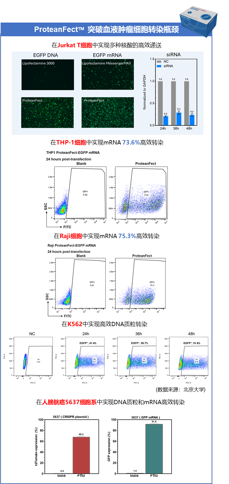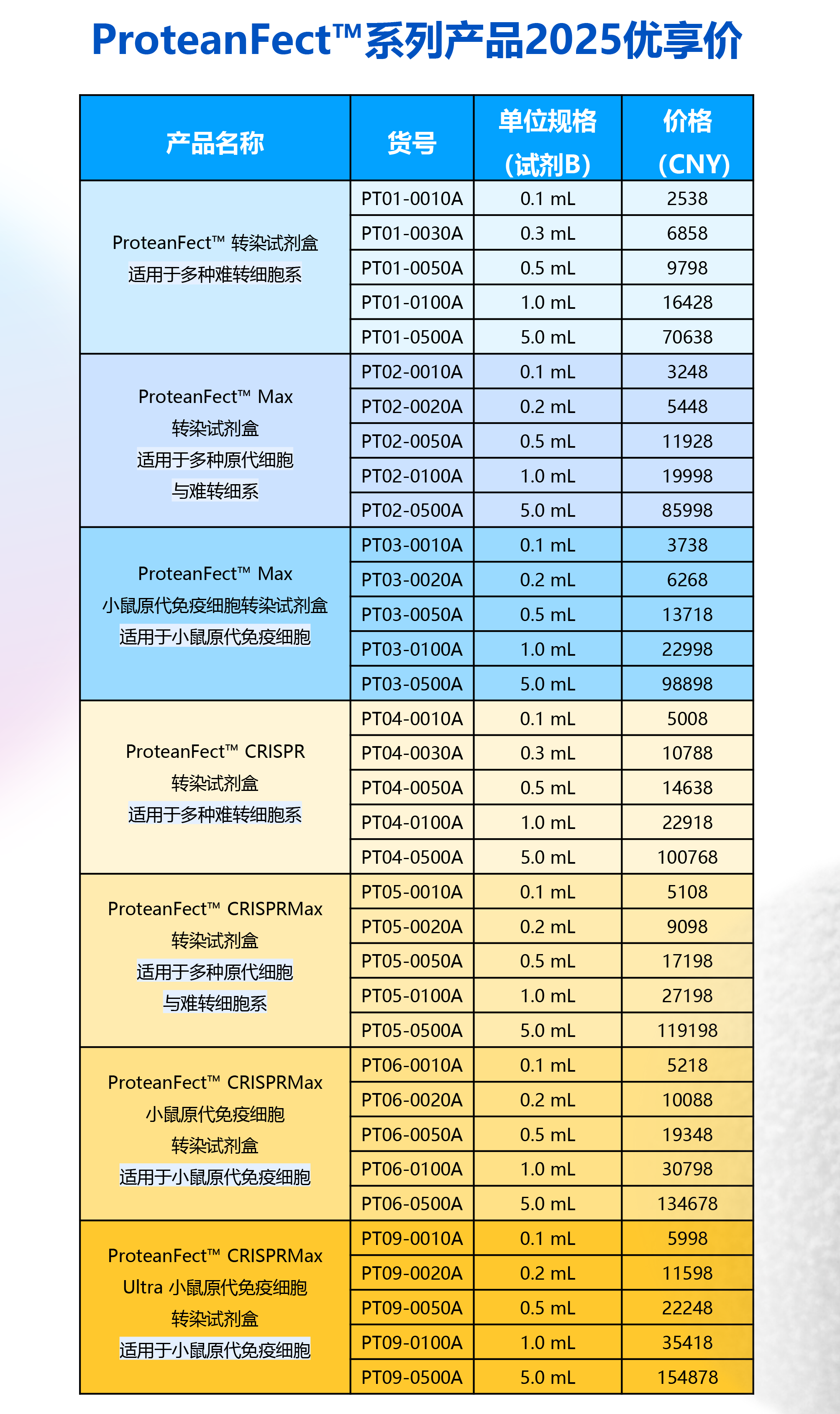 基于這些技術(shù)優(yōu)勢,我們強烈推薦使用 ProteanFect 轉染試劑盒,以實(shí)現更高效的基因表達。ProteanFect™ 系列轉染試劑盒現已全面上市,滿(mǎn)足各類(lèi)難轉腫瘤細胞的基因遞送需求。